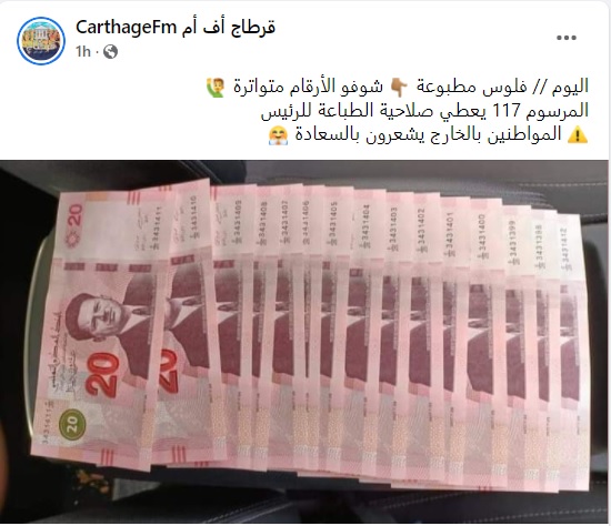 Il s'agit, selon la page en question, d'une preuve de billets imprimés assurant que le décret 117 promulgué par le chef de l'Etat, Kaïs Saïed lui donnait cette prérogative (impression de billets).
