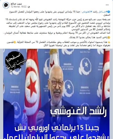 نشرت العديد من الصفحات على موقع التواصل الاجتماعي فيسبوك مؤخرا خبرا جاء فيه إن رئيس البرلمان المعلقة أعماله ورئيس حزب حركة النهضة راشد الغنوشي صرح انه" قد قام باستدعاء 15 برلمانيا اوروبيا قصد الحضور في الأسبوع القادم لكي يشهدوا على رجوع مجلس نواب الشعب إلى سالف نشاطه" وجاء في نفس الخبر "كما اضاف الغنوشي ان اكثر من 70 وسيلة اعلام وطنية و دولية ستشرف على متابعة فعالية أعمال البرلمان" وقد تداولت هذا الخبر العديد من الصفحات على غرار صفحة "سيب صالح" وصفحة "الفلاقة" كما قام بمشاركته والتعليق عليه العديد من رواد الوسائط الاجتماعية. وبالتحري في صحة ما جاء في الخبر اتضح إنه زائف.